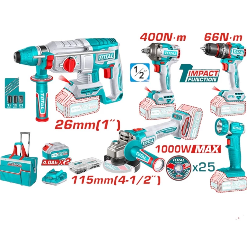 طقم كومبو احترافي مكوّن من 9 أدوات تعمل ببطارية 20 فولت، يشمل شنيور، دريل، هيلتي، صاروخ، كشاف، بالإضافة إلى طقم لقم، بنط، وأحجار قطع. مُعبأ في شنطة قوية مزوّدة بعجلات لسهولة النقل. أداء قوي ومتكامل للمحترفين والهواة.