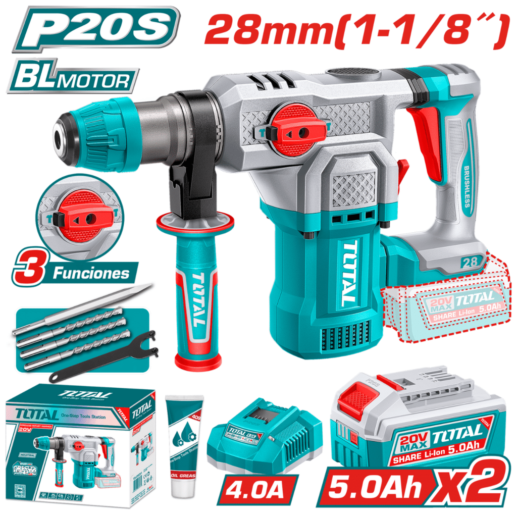 الملحقات: ٣ رؤوس حفر (٨، ١٠، ١٢ مم) – إزميل – أنبوب شحم – مفتاح ربط – بطاريتان ٥٫٠ أمبير/ساعة (TFBLI20531) – شاحن (TFCLI20411)